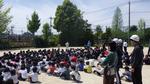 防災頭巾をかぶって,全校みんなで実際に校庭へ避難しました。少し時間はかかってしまいましたが「おかしも」を守って避難することができました。