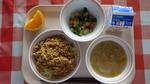 | 給食のプルコギ丼には細切の高野豆腐がはいっています。あじさいの花が満開の時期、デザートはあじさいゼリーでした。 | ジャージャー麺の具は豚ひき肉と大豆ミートを合わせて作っています。 | 今日のデザートは初夏が旬のさくらんぼ。山形県産のおいしい佐藤錦でした。 | シーフードピラフはカレー味。好評でした。皮がむいてある冷凍みかんにみんなびっくりしていました。 | |
