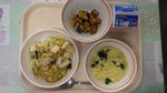 | オムライス コーンサラダ クラムチャウダー 牛乳 | 味噌ラーメン わかさぎフリッター 小松菜の中華和え チョコ蒸しパン オレンジ 牛乳 | ご飯 大豆とひじきの佃煮 肉豆腐 大根の味噌汁 しら玉黒蜜きな粉 牛乳 | バンズパン 鮭のフレーク焼き リボンマカロニサラダ コーンスープ デコポン 牛乳 |