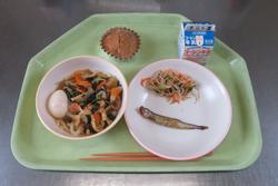 本日の給食は、中秋の名月にちなんで、月見うどん、ししゃものカレー焼き、バナナプルーンケーキ、もやしの辛子和え、牛乳です。