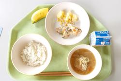 今日の給食は、ごはん、鮭のきのこソース、コーンポテト、根菜汁、バナナ、牛乳です。
