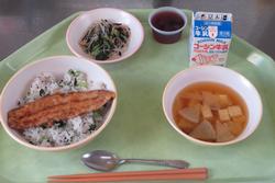 今日の給食は、秋刀魚と小松菜のスタミナ丼、なめこ汁、春雨とひじきサラダ、ブルーベリーゼリー、牛乳です。