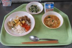本日の給食は、アジアごはんでした。ビビンバ丼、ニラともやしソテーフォーのスープ、牛乳です。