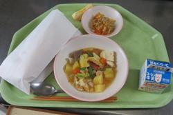 今日の給食は、きな粉揚げパン、洋風おでん、カリカリじゃこサラダ、りんご、牛乳です。