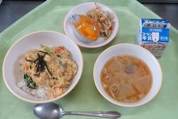 今日の給食は、親子丼、カリカリごぼうサラダ、呉汁、黄桃、牛乳です。
