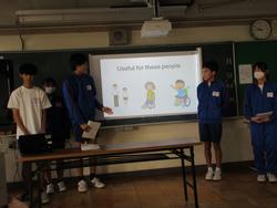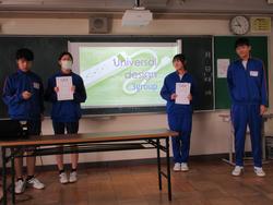2年の英語の授業では、教科書の題材で、学校に取り入れたいユニバーサルデザインについて、各グループ毎のプレゼンテーションを発表しました。