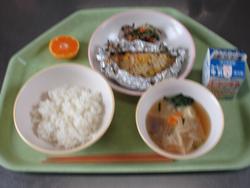 今日の給食は、ごはん、鮭のチャンチャン焼き、もやしののり酢和え、呉汁、みかん、牛乳です。