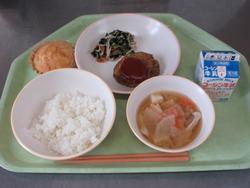 松戸市産新米ごはん、鰯のハンバーグ、小松菜の海苔和え、いものこ汁、梨ケーキ、牛乳です。