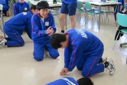 3~4人1組で、病人の発見から周囲への協力要請、消防への連絡、AED、心肺蘇生を500mlのペットボトルを使って、心臓マッサージを体験しました。