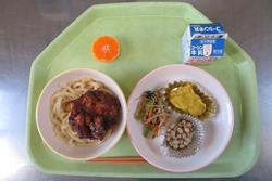 本日の給食は、海鮮かき揚げうどん、もやしのからし和え、かみかみ豆、スイートポテト、みかん、牛乳です。