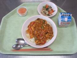 本日の給食は、なす入りチキンカレー、キャベツと海苔のサラダ、お米ムース(りんご)、牛乳です。
