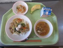 本日の給食は、中華丼、中華風コーンスープ、もやしのナムル、バナナ、牛乳です。