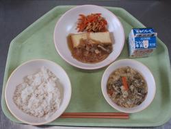 本日の給食は、ごはん、生揚げの和風きのこソース、もずくスープ、大根キンピラ、牛乳です。