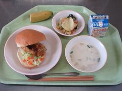 本日の給食は、セルフフィッシュバーガー、クラムチャウダー、チップスじゃこサラダ、バナナ、牛乳です。