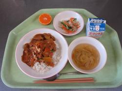 今日の給食は、冬野菜カレー、キャベツのスープ、大根サラダ、みかん、牛乳です。