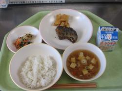 本日の給食は、ごはん、さごしのカレー揚げ、小松菜の海苔和え、けんちん汁、牛乳です。