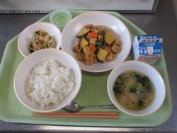 本日の給食は、ごはん、高野豆腐の揚げ煮、もやしの辛子和え、大根の味噌汁、青リンゴゼリー、牛乳です。