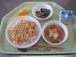 今日の給食は、あさり玉丼、せんべい汁、ひじきサラダ、オレンジ、牛乳です。