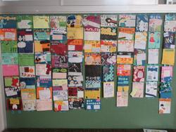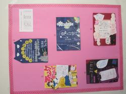 図書室前に、1年生の国語の授業でとりくんだ、本のポップが飾られています。