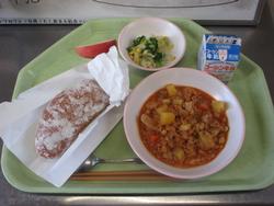今日の給食は、ミルキー揚げパン、ポークチリビーンズ、グリーンコーンサラダ、りんご、牛乳です。