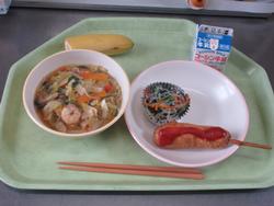 本日の給食は、長崎ちゃんぽんめん、手作りアメリカンドッグ、春雨とひじきサラダ、バナナ、牛乳です。