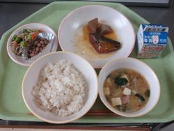 本日の給食は、ごはん、鯖のオレンジ煮、小松菜の海苔和え、豚汁、ココア豆、牛乳です。