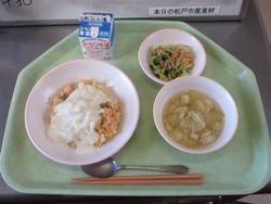 本日の給食は、チキンピラフのクリームソース、ツナサラダ、アルファベットスープ、牛乳です。