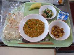 学校給食週間3日目、本日の給食は、ナン、キーマカレー、スパイシーポテトビーンズ、こまツナサラダ、バナナ、牛乳です。