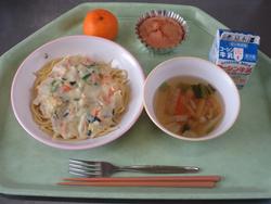本日の給食は、ツナとキャベツのクリームソースパスタ、野菜スープ、おからカップケーキ、ぽんかん、牛乳です。