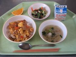 本日の給食は、豚玉キムチ丼、わかめサラダ、ウズラ卵と小松菜のスープ、国産ネーブル、牛乳です。