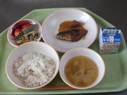 本日の給食は、ごはん、鯖の味噌煮、小松菜ののり和え、大根の味噌汁、いちご、牛乳です。