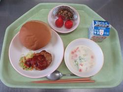 本日の給食は、セルフハンバーガー、クラムチャウダー、黒糖まめ、いちご、牛乳です。