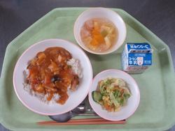 本日の給食は、カレー、コーンサラダ、フルーツポンチ、牛乳です。