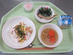 本日の給食は、ちらしずし、ししゃもの胡麻七味焼き、春雨とひじきサラダ、花ふのスープ、3色ゼリー、牛乳です。