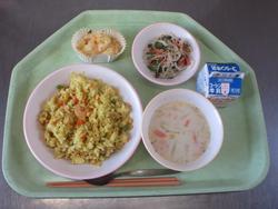本日の給食は、シーフードカレーピラフ、もやしとのりのサラダ、じゃがいものマヨネーズ焼き、クリームコーンスープ、牛乳です。