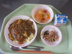 本日は今年度最後の給食でした。ラスト給食メニューは、ポークポパイカレー、れんこんチップスじゃこサラダ、フルーツポンチ 牛乳です。
