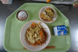 本日の給食は、揚げ焼きそば五目あんかけ、大豆入り餃子、大根とキュウリのナムル、カフェオレケーキ、牛乳です。