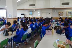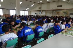 1年生の給食は明日からスタートします。今日は配膳の流れを確認し、食堂でお弁当を食べました。