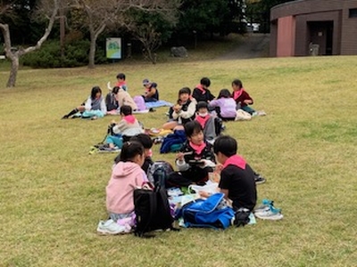 12:10 グループ活動が終わったら待ちに待ったお弁当の時間です。自然の中で食べるお弁当の味もまた格別です。感謝していただきま〜す!