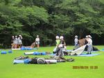 テント泊の朝は目覚めが早いようです。起床前にあちこちで起きている様子がありました。寝袋をたたんで朝の集いに行きました。みんなでラジオ体操をしました。次に、宿舎に移動し朝食です。朝からおかわりをする猛者もいました。食後は荷物の整理、部屋の掃除とテントの片づけを行いました。「来た時よりもきれいに。」という合言葉で分担の場所をきれいにしました。広場に荷物を持って集合しました。実行委員の司会で退所式を行いました。みんなでお世話になった職員の方にお礼を言いました。