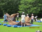 おいしいカレーラスでおなか一杯になった後は、テントの設営です。子供たちは初めての体験に顔を輝かせています。自分たちのテントを自分たちで建てるので職員の方の話を真剣に聞いて取り組みました。日陰のない場所でしたが、曇りのためそこまで暑くなく助かりました。出来上がったテントの中で寝転んだり、窓からのぞいたり楽しそうでした。