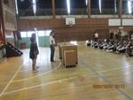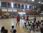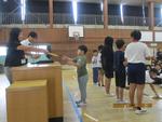 次に陸上部が入場し、担当の先生が選手を紹介しました。みんな立派な態度でした。体育館でできる、走り高跳びとハードル走を披露しました。子供たちは「すごい。」「早い。」と歓声を上げました。部長から「自己ベスト更新してきます。」と熱い決意が述べられました。