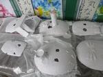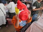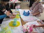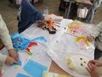 2年生の3学級で図画工作をしていました。子供たちはとても楽しそうに友達と見せ合いながら作っています。型に少し厚めの白い紙で土台を作って乾かします。目になる部分が空いています。乾かした後は、お花紙に水のりをつけて貼り付けていきます。お花紙の透き通る良さを生かして同じ色を重ねたり、他の色を合わせたりして自分なりの色を表現します。持ってきたコップや容器を使って目や角を作っています。「見て。」と作成途中のお面をかぶって見せてくれました。