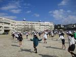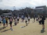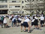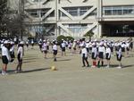今日はお天気が良く、お日様たっぷり浴びて楽しく活動しました。始めに短なわの練習です。音楽に合わせて様々な飛び方を練習します。担当の先生の「まえ、うしろ、みぎ、ひだり。」という掛け声に合わせて移動しながら駆け足跳びをしました。短なわの後は、二人組で力試しの運動です。腰を低くしてお互いを押し合います。学級ごとの運動になります。学年でボールを蹴ったり投げたりする運動を行うところもありました。