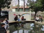 続いて壁面の修繕です。壁面の上から水が流れる仕組みが壊れていたのを、取水栓を発見し、そこから水を流して塩ビ管を修理して水が再び流れるようにしてくださいました。「今川水道だよ。」と笑いながらお話ししてくださいましたが、本当に何でもできてすごい方です。最後は、壁面のペンキの塗り替えです。全体をベージュできれいに塗って、もともとあった虹はきれいなので残しておくことにしました。そして、イルカとボールは上からきれいに塗り直しました。本当に今川氏が子供たちに協力してくださらなかったらできなかったと思います。