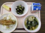 1日 ごまご飯 ほきの甘辛ソースかけ 茎わかめサラダ 豚汁 キウイ