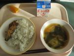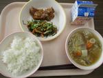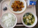 19日 ご飯 白身魚とコーンの揚げ煮 青菜と卵のスープ 干しプルーン