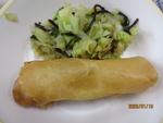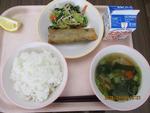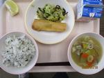19日 わかめごはん 鮭とチーズの春巻き キャベツときゅうりのごま和え さつま汁 はるか