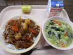 2日 厚揚げ入り豚キムチパワー丼 洋風わかめスープ ポップビーンズ きよみオレンジ