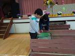 なった机やいすも、気持ちよく次の人に渡せるように磨きます。「ありがとう。お世話になり